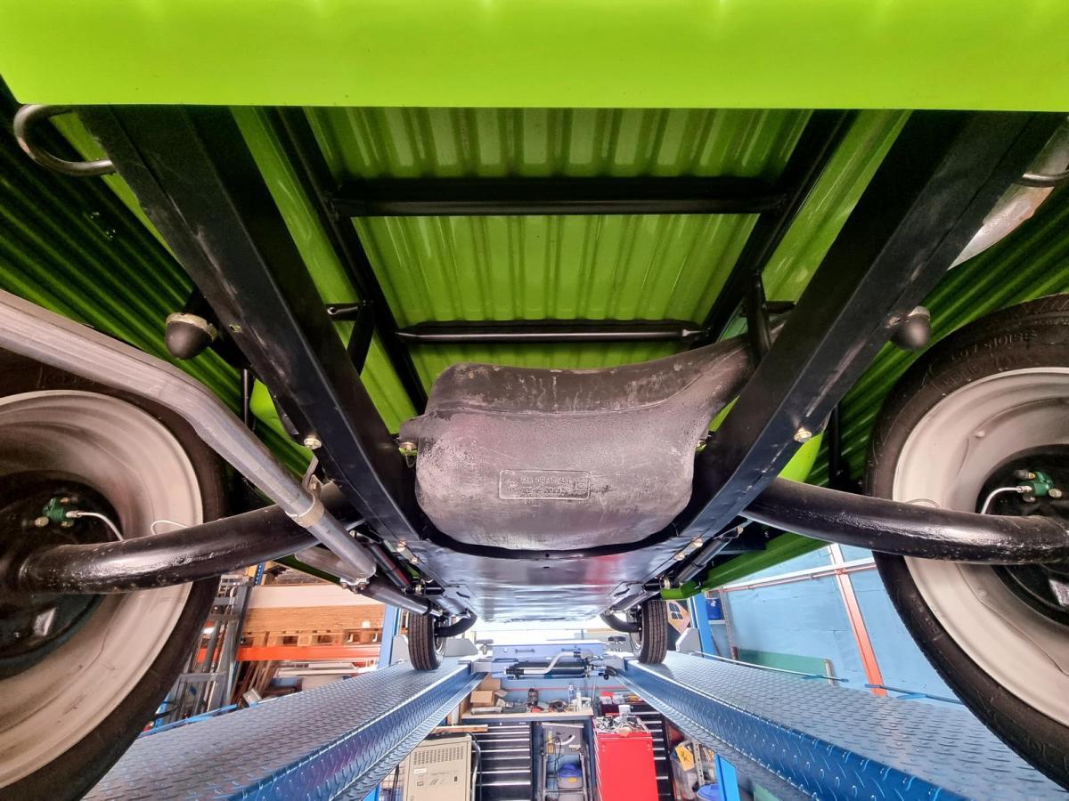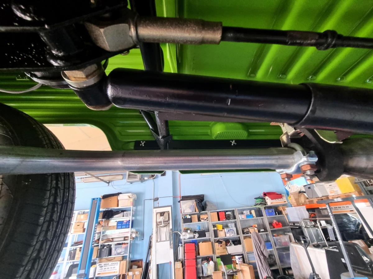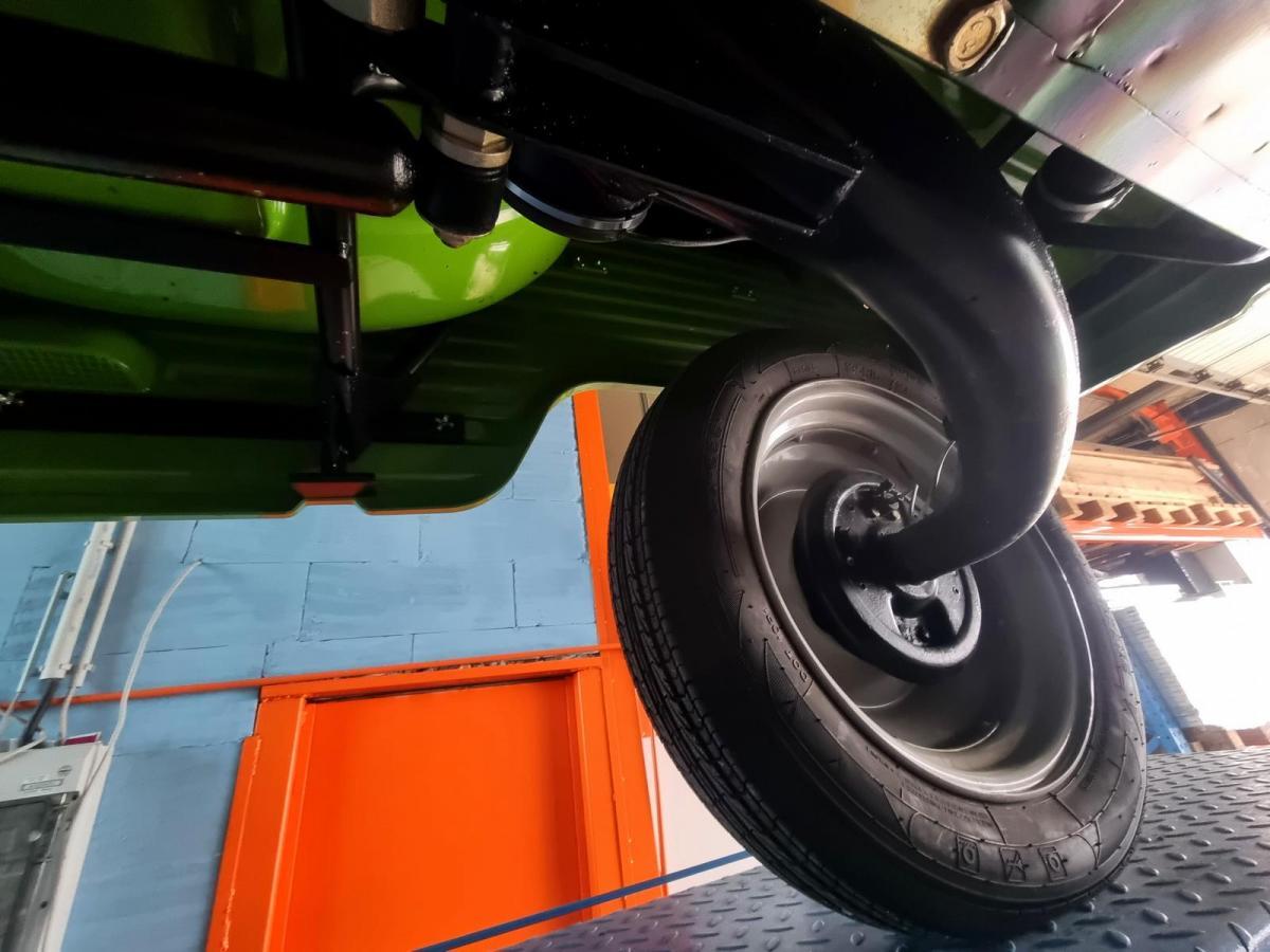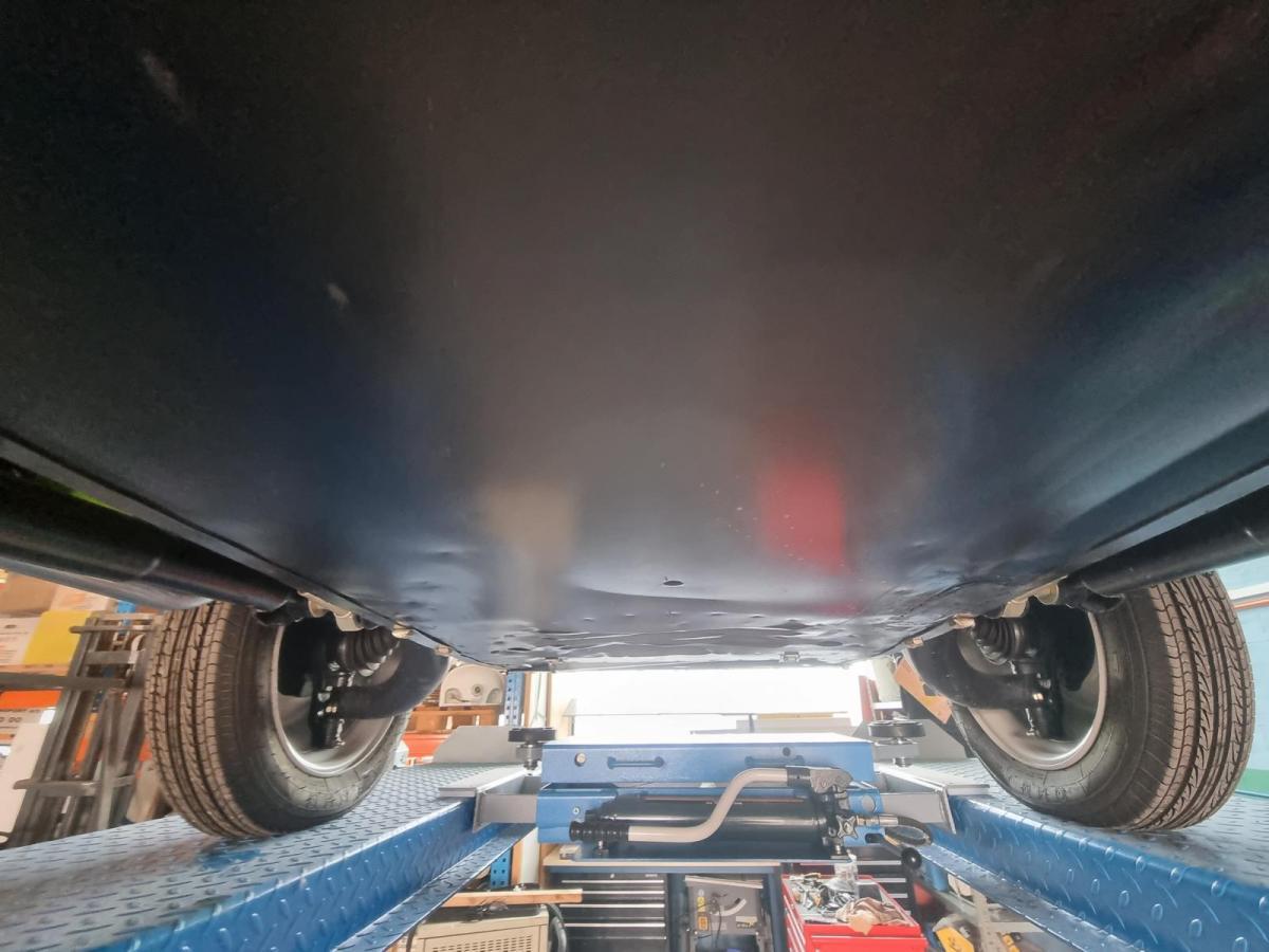 Zur Demonstration müssten wir das Auto am besten auf der Seite liegend präsentieren: Der Unterboden zeigt sich in dem gleichen hochglänzenden zeittypischen gift-grün, wie der Rest der Karosserie. Die Achsen, die Bremsen, das Chassis sehen aus, als wäre der Méhari gerade vom Band gelaufen. Selbst die verzinkten Schrauben am Unterboden sind nicht mal angelaufen.