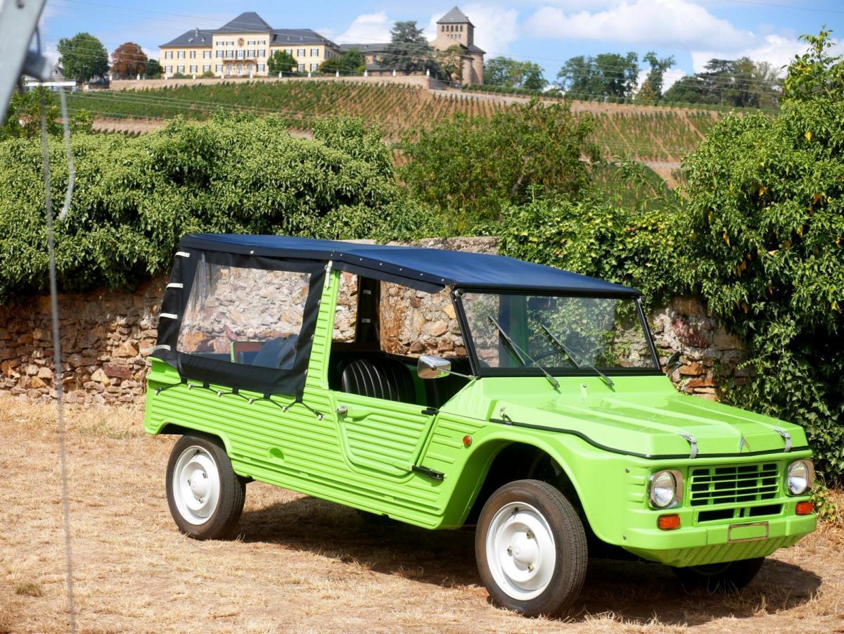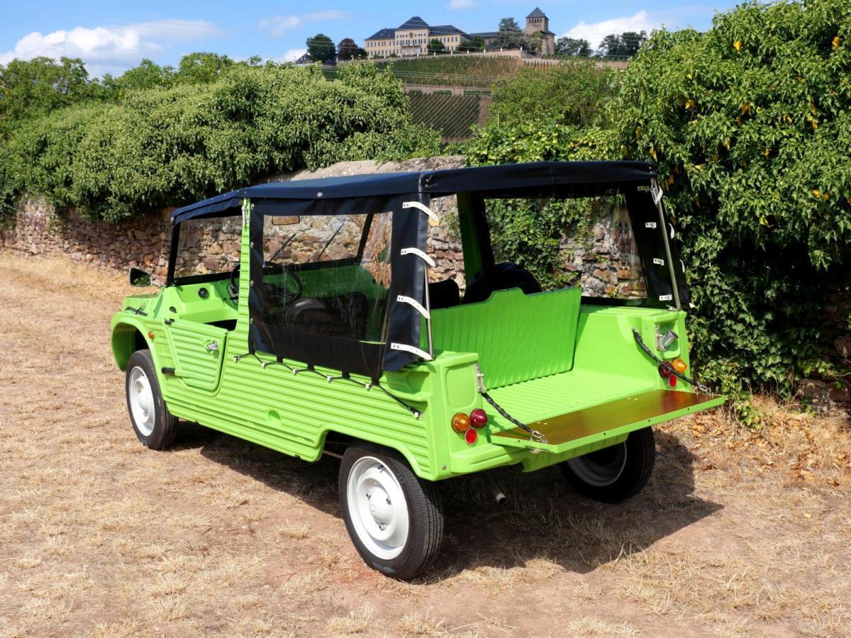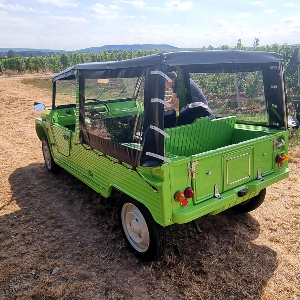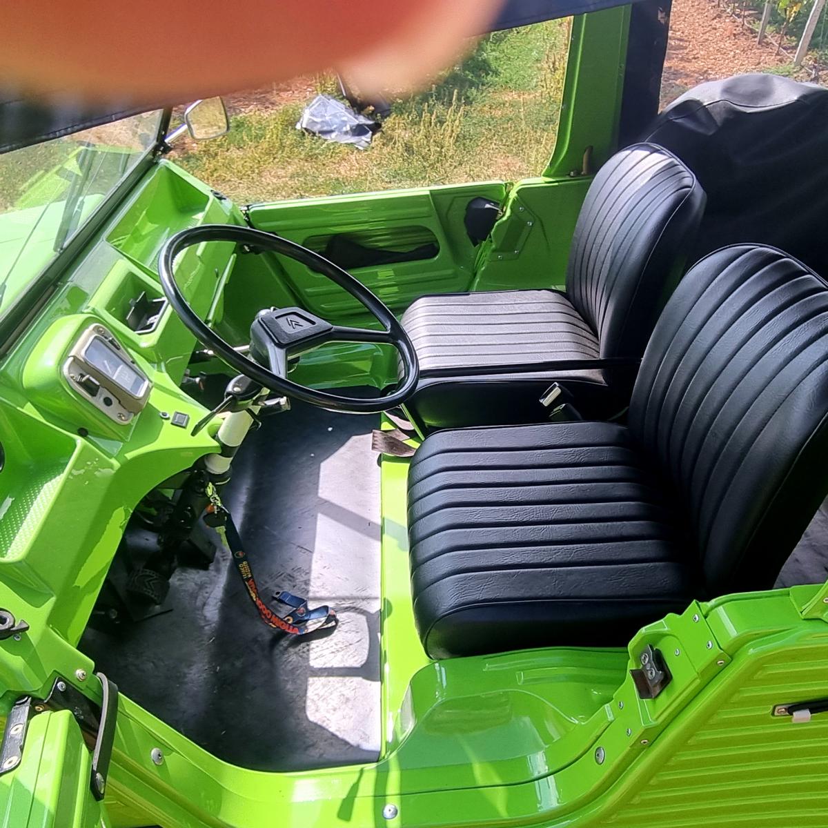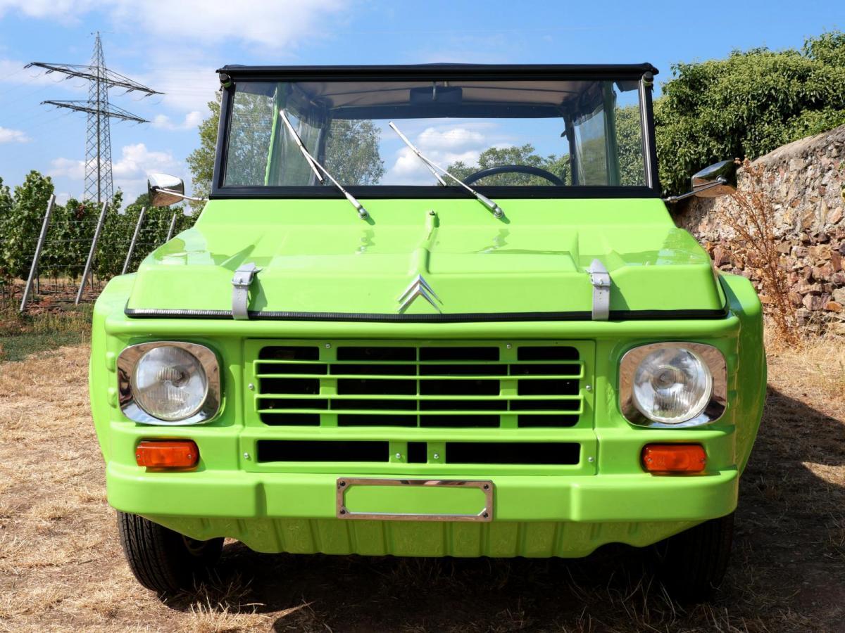 Vert tibesti, quelle couleur, in der der vollrestaurierte Citroën Méhari daher kommt. Vom Zustand kaum zu übertreffen fühlt sich alles neu an: die Sitze, die Karosserie, das Verdeck, der Motor.