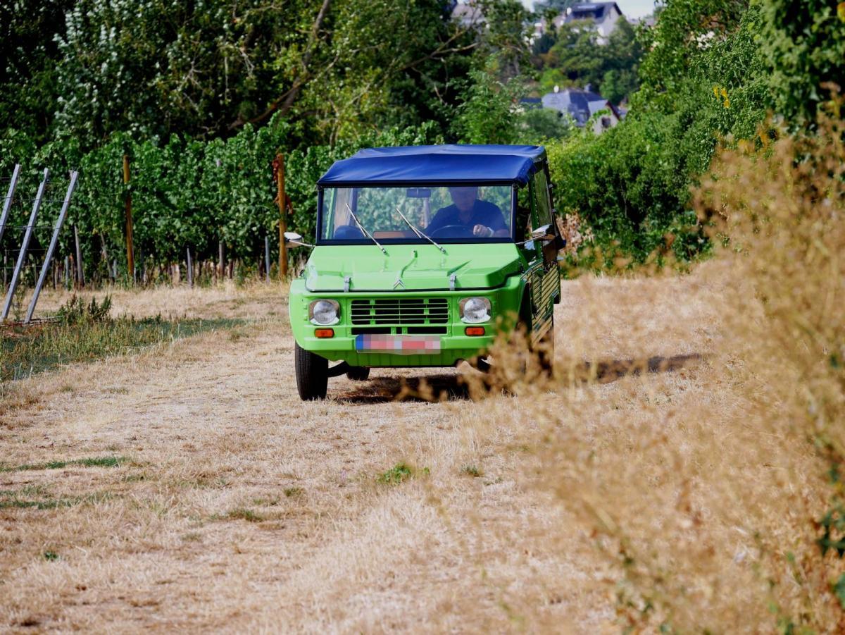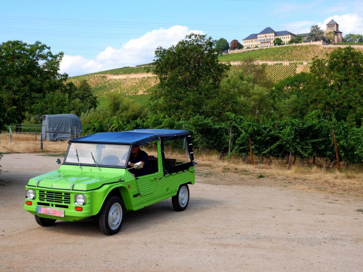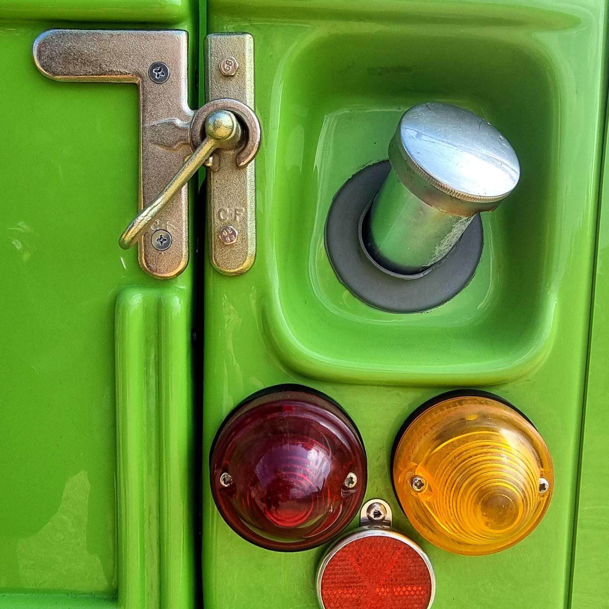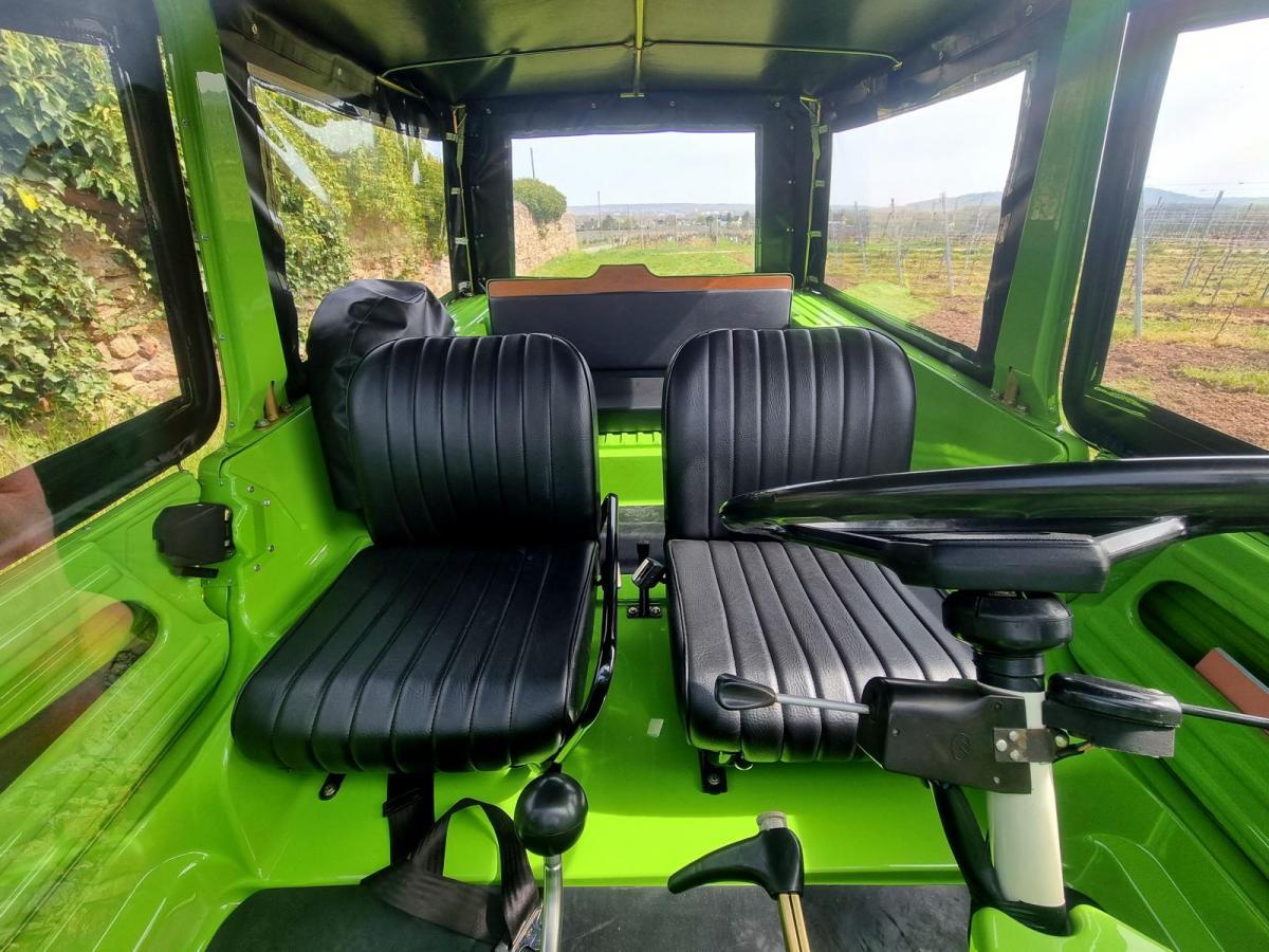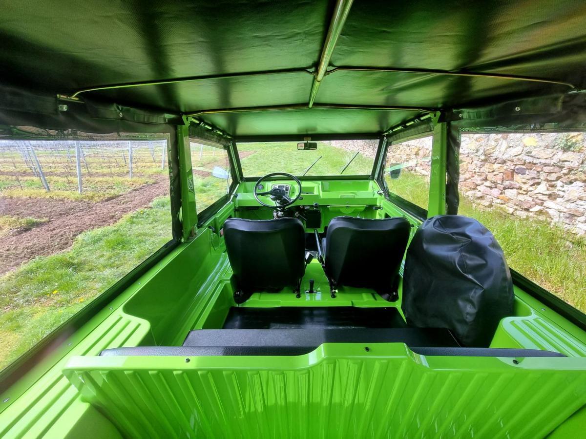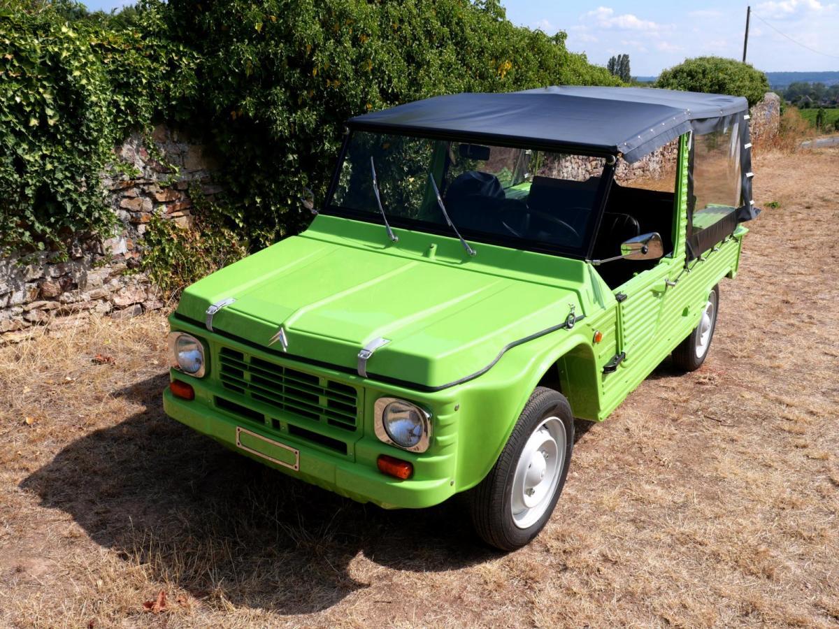 Vert tibesti, quelle couleur, in der der vollrestaurierte Citroën Méhari daher kommt. Vom Zustand kaum zu übertreffen fühlt sich alles neu an: die Sitze, die Karosserie, das Verdeck, der Motor.